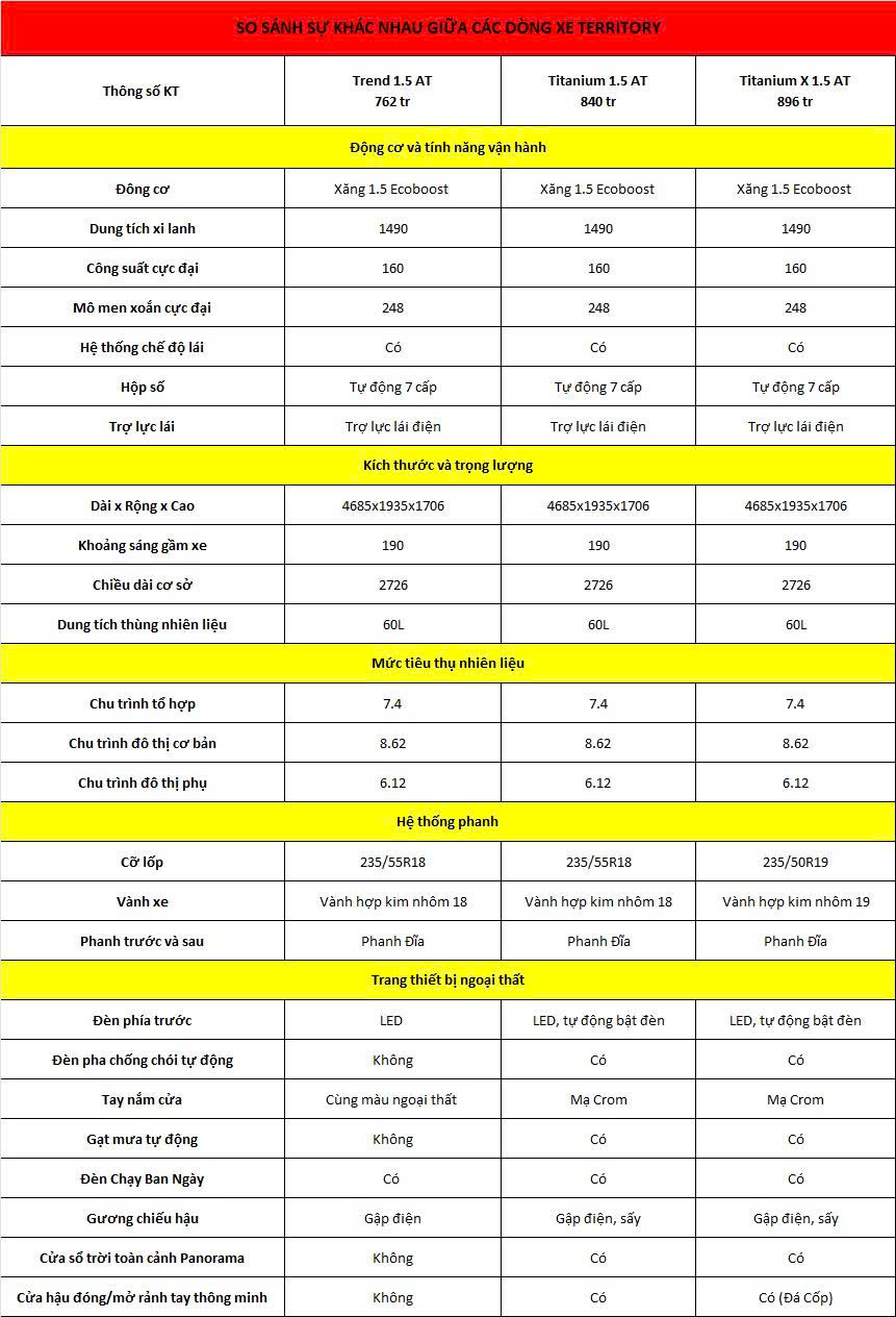 | Thông số kỹ thuật | Territory Trend | Territory Titanium | Territory Titanium X |