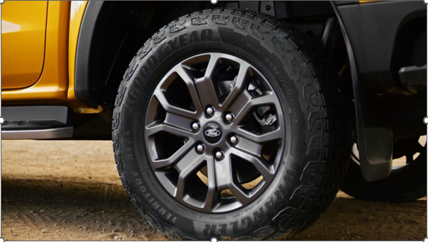 Ford Ranger Wildtrak 2023 được trang bị mâm hợp kim nhôm đúc 18inch với logo Ford nổi bật ở vị trí trung tâm, kích thước lốp là 255/65R18. Phần hông xe được trang bị 2 mang cá 2 bên có chữ Bi-turbo rất thể thao và để phân biệt với các phiên bản khác. Gương chiếu hậu xe được sơn mạ màu Titan được trang bị hệ thống điều khiển điện và gập điện.